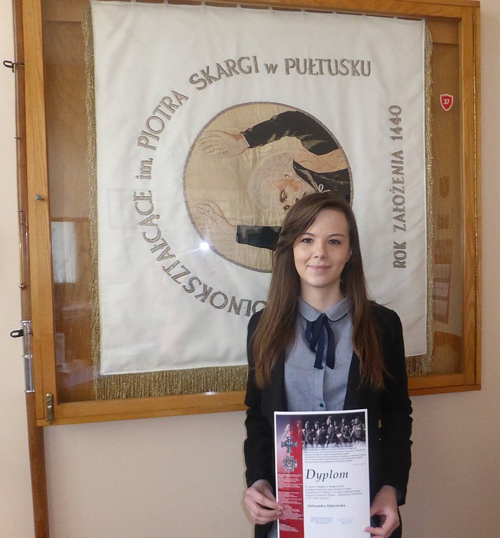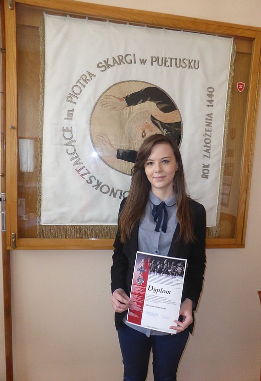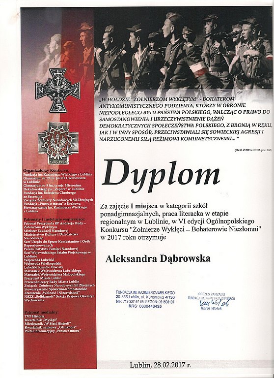 Aleksandra Dąbrowska, uczennica klasy III D została laureatką etapu regionalnego VI edycji Ogólnopolskiego Konkursu „Żołnierze Wyklęci – Bohaterowie Niezłomni”. Patronat nad Konkursem objęli m. in.: Prezydent Andrzej Duda, Minister Edukacji Narodowej, Minister Obrony Narodowej, Minister Kultury i Dziedzictwa Narodowego, Kierownik Urzędu do Spraw Kombatantów i Osób Represjonowanych, Prezes Instytutu Pamięci Narodowej, Rada Ochrony Pamięci Walk i Męczeństwa. Jego organizatorami są Fundacja im. Kazimierza Wielkiego z Lublina, Gimnazjum nr 19 im. Józefa Czechowicza w Lublinie, Gimnazjum nr 9 im. cc mjr Hieronima Dekutowskiego ps. „Zapora” w Lublinie, Związek Żołnierzy Narodowych Sił Zbrojnych, Fundacja im. Bolesława Chrobrego ze Szczecina, Fundacja „Prostu z mostu” z Krakowa, Stowarzyszenie im. Kazimierza Wielkiego. Esej Aleksandry pt. ,,Traktat o niezłomności” został uznany za najlepszy wśród kilkudziesięciu prac nadesłanych ze szkół województwa lubelskiego, mazowieckiego, świętokrzyskiego, warmińsko-mazurskiego, podlaskiego. Uczennicy i jej opiekunce nauczycielce historii Annie Krawczyńskiej gratulujemy sukcesu.
