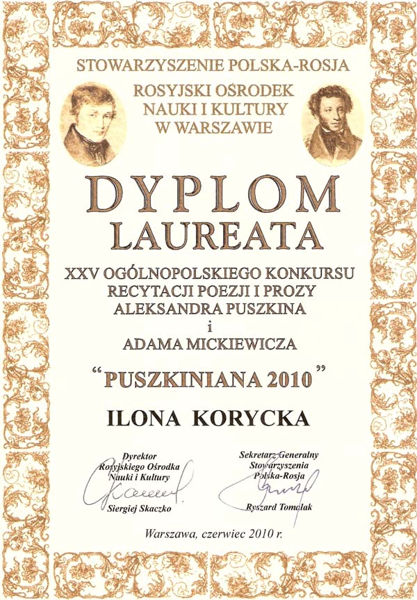 Dnia 29 marca 2010r. w Domu Przyjaźni w Warszawie odbył się , jak co roku, Ogólnopolski Konkurs Recytacji Poezji i Prozy Aleksandra Puszkina i Adama Mickiewicza w języku rosyjskim.