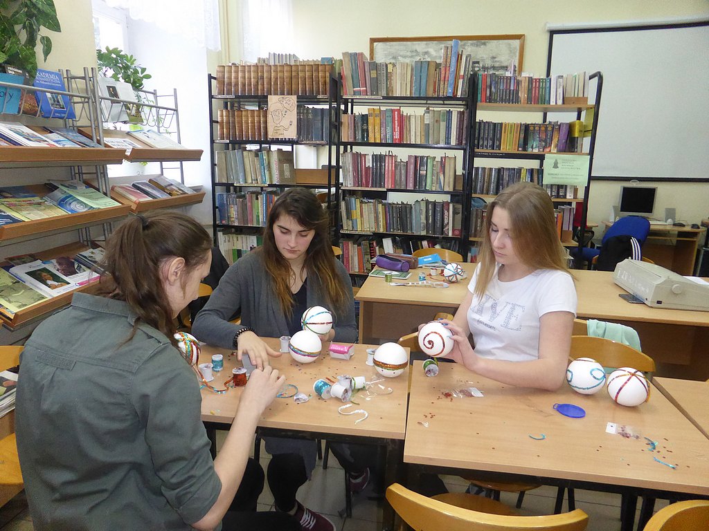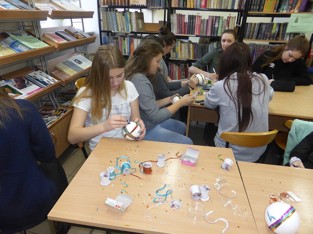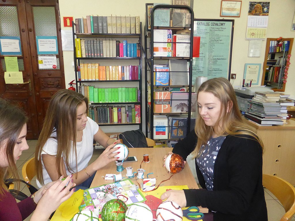 W ostatnich przedświątecznych dniach w bibliotece szkolnej uczniowie mieli możliwość wykazania się zdolnościami manualnymi. Dzięki p. Annie Morawskiej przewodniczącej Rady Rodziców, która pozyskała styropianowe bombki, całe klasy w doskonałych nastrojach dekorowały według własnych, często bardzo oryginalnych, pomysłów, ozdoby przeznaczone na szkolną choinkę.