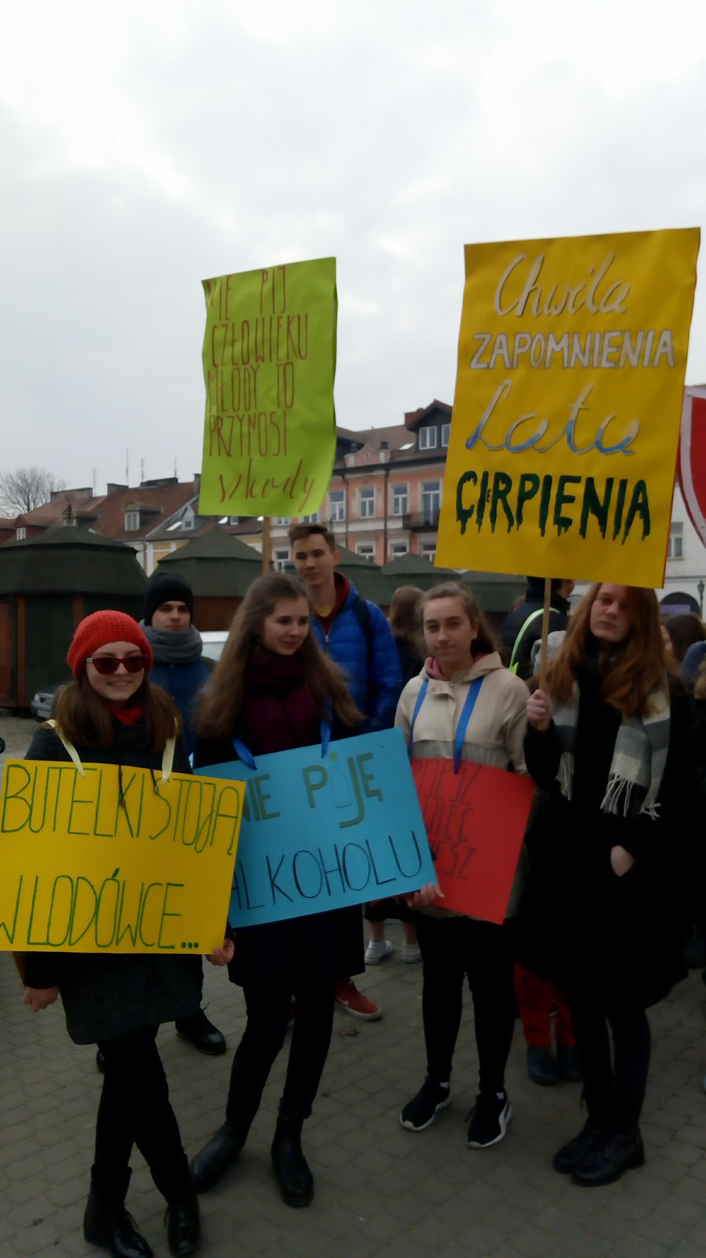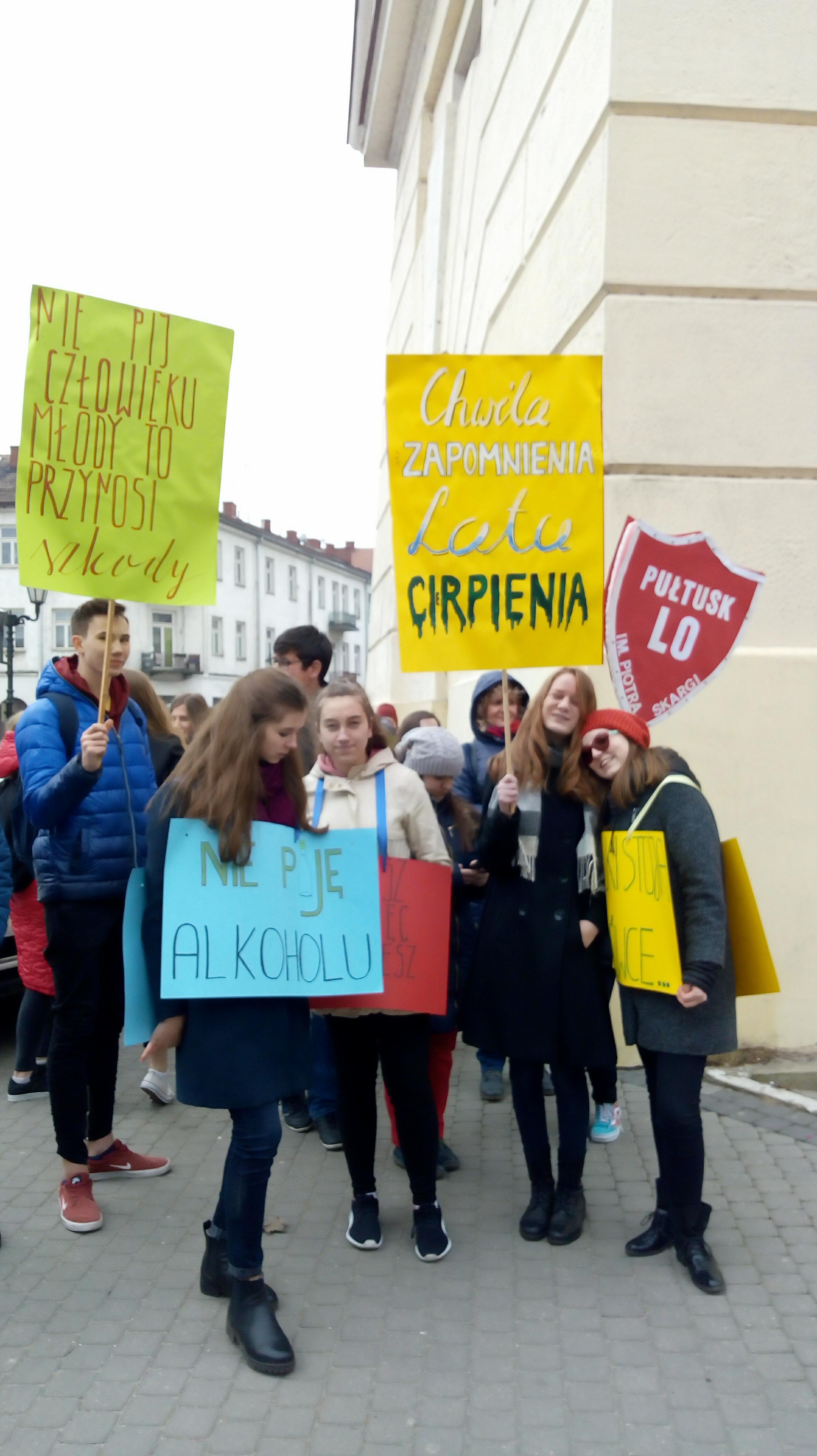 26 marca to Ogólnopolski Dzień Trzeźwości. W tym dniu uczniowie klas I C i I D naszego Liceum wzięli udział w happeningu organizowanym przez Komendę Powiatową Policji w Pułtusku pod hasłem „Bez alkoholu-bez problemów” Ulicami Pułtuska przeszliśmy wraz z kolegami i koleżankami wszystkich pułtuskich szkół ponadgimnazjalnych. Głównym celem przedsięwzięcia było przede wszystkim zwrócenie uwagi na szkody, jakie wyrządza alkohol w życiu młodych ludzi. Happening był okazją, by młodzież i dorośli choć chwilę pomyśleli o problemie alkoholizmu i wielu dramatycznych skutkach społecznych, zdrowotnych i ekonomicznych, jakie niesie ze sobą używanie i nadużywanie alkoholu.
