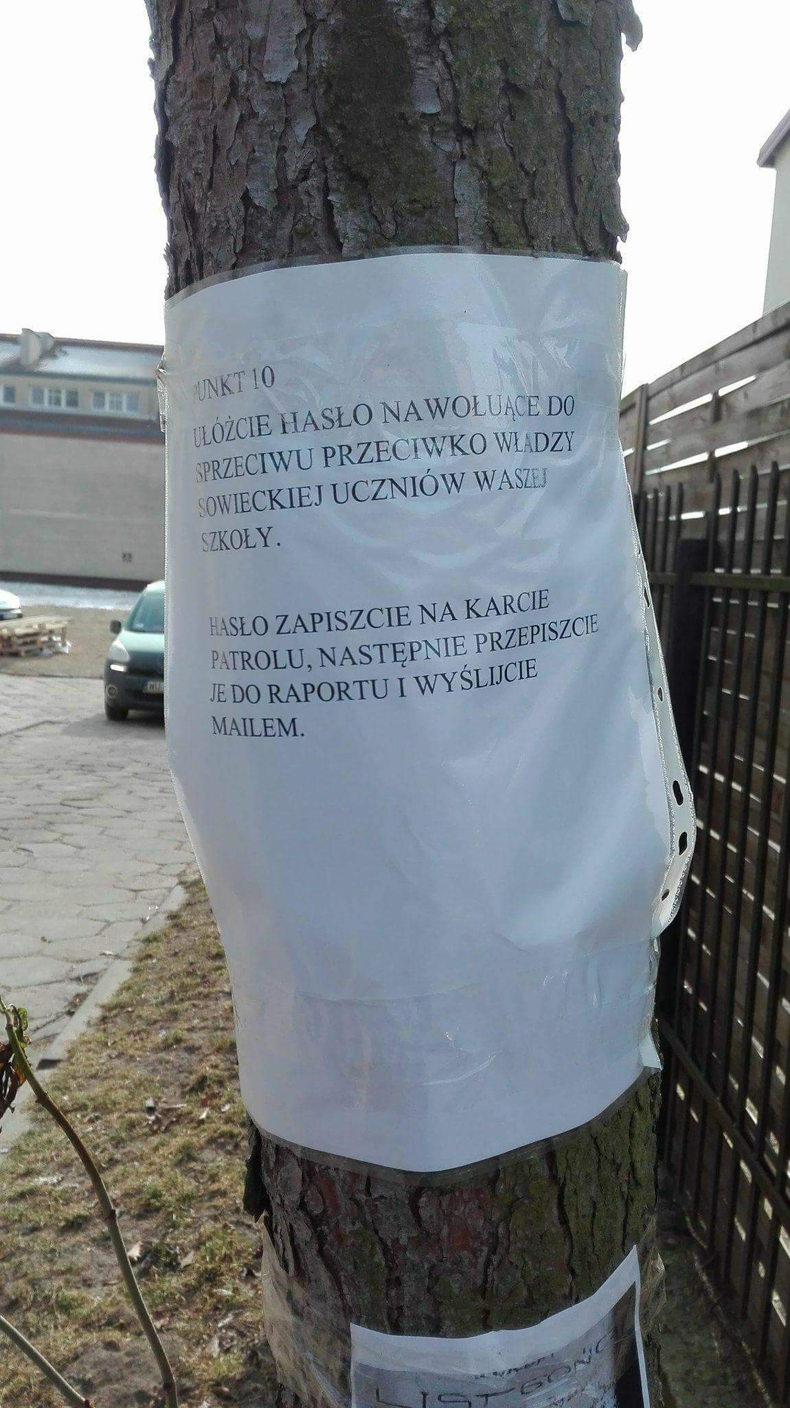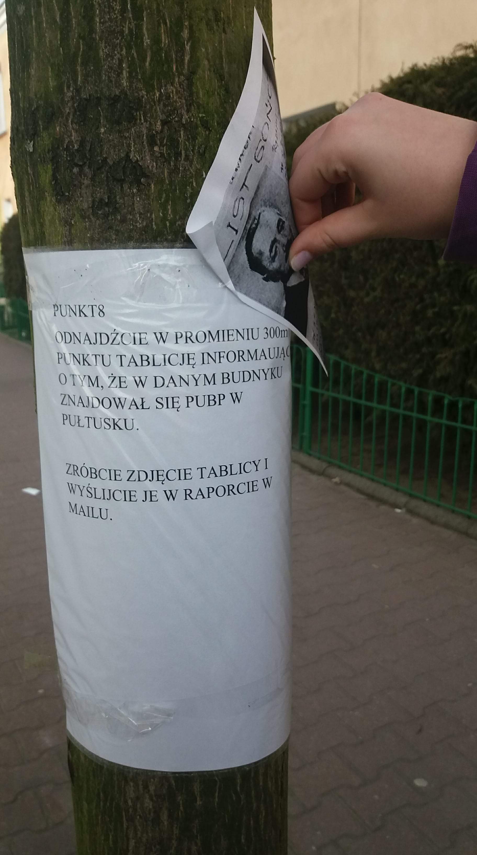 i nauczycielami historii naszej szkoły. Uczniowie wszystkich klas I i II, podzieleni na ok. 10-osobowe drużyny wraz z liderami wykonali 11 zadań o charakterze historycznym w ramach gry ulicznej pod tytułem „Obława”. Zadania łatwe nie były (rozszyfrowanie wiadomości umieszczonej na oknie w Kinie, wymyślenie własnego szyfru, narysowanie planu odbicia więźniów, zaśpiewanie piosenki wojskowej, podanie trzech nazwisk żołnierzy wyklętych) Ponadto, punkty do ich realizacji znajdowały się w różnych częściach miasta (Dom Polonii, Policja, Kino, Kościół św. Józefa, wieża ratuszowa, Caritas, mostek przy ul. Wspólnej).