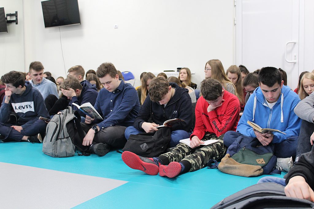 Dziś uczciliśmy jego pamięć w sposób szczególny - uczniowie klas pierwszych spotkali się w sali gimnastycznej i wspólnie słuchali czytanych przez koleżanki i kolegów fragmentów „Wspomnień niebieskiego mundurka”. Mieli również możliwość śledzenia tekstu i oglądania ilustracji w specjalnie przygotowanych egzemplarzach tej wyjątkowej dla nas książki.