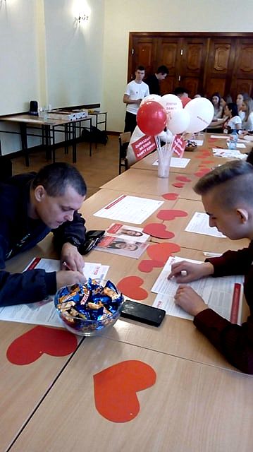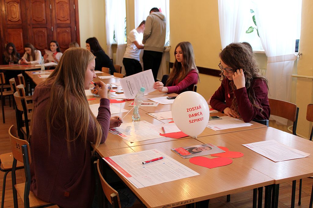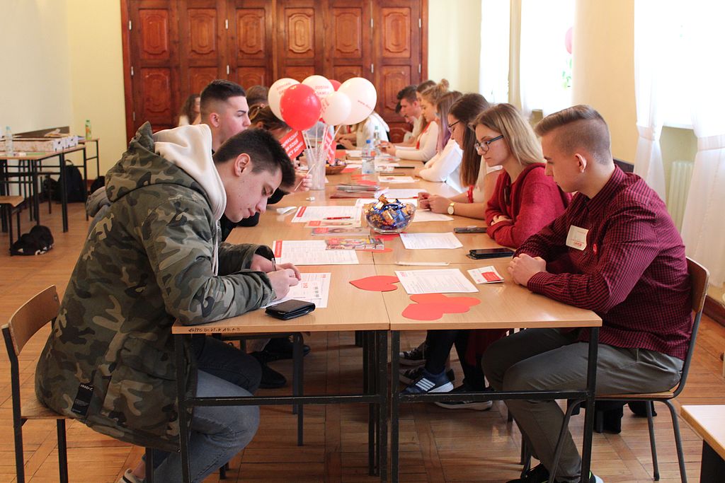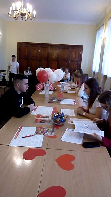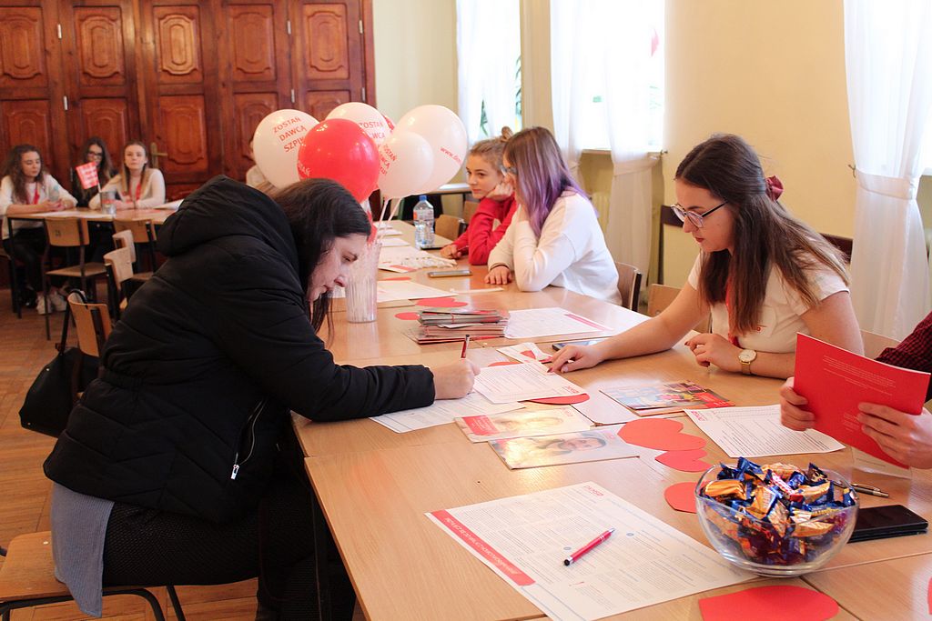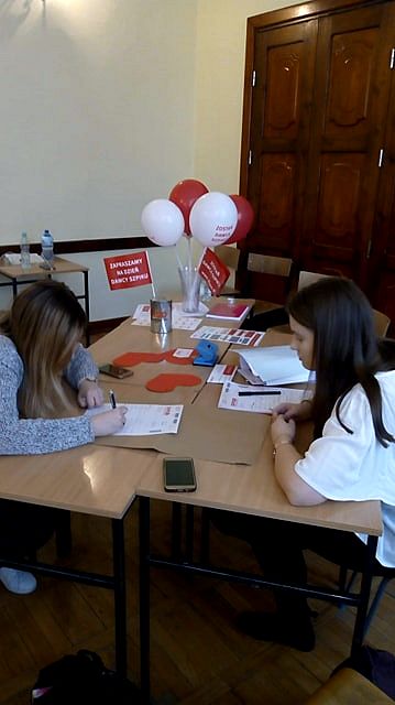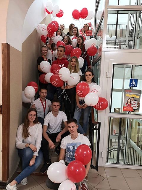 14 lutego był w szkole wyjątkowym dniem, i to nie tylko z powodu Walentynek. Już przy wejściu witały wchodzących plakaty, zaproszenia, czerwone serduszka, białe i czerwone balony z logo Fundacji DKMS. Atmosfera akcji była naprawdę niezwykła. W pięknie udekorowanej auli szkolnej już o godzinie 8.50 wolontariusze z radością przywitali pierwszą Osobę, która przyszła zarejestrować się jako potencjalny dawca szpiku. I tak już było do godziny 17.00! Wolontariusze zarejestrowali aż 71 potencjalnych dawców szpiku! Dla wszystkich organizatorów #KOMÓRKOMANII w Skardze była to wielka radość a jednocześnie miłe zaskoczenie, że tak wiele osób odpowiedziało na nasze zaproszenie, rozumiało cel i zechciało zaangażować się w bezcenną pomoc innym.